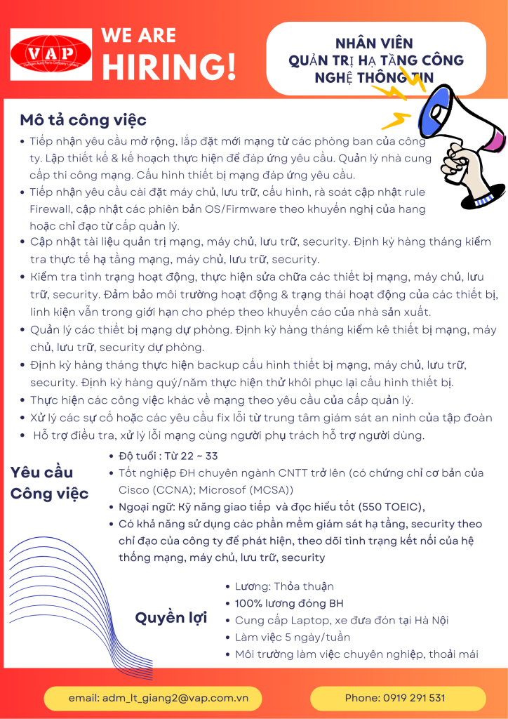Vị trí tuyển dụng: Nhân viên quản trị hạ tầng công nghệ thông tin
